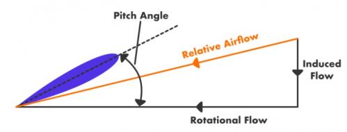 Relative airflow is the combined effect of rotational and induced flow, determining the blade’s aerodynamic behaviour.